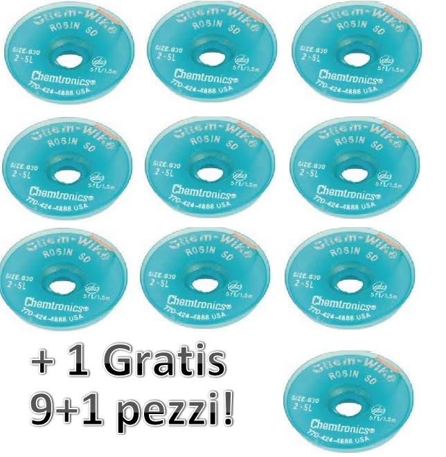 Un kit di 10 rocchetti di treccia dissaldante per circuiti della rinomata CHEM-WIK da 1.9mm 1.5 metri per totali 15 metri. Elevata qualità, massimo assorbenza dello stagno.