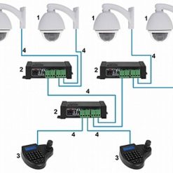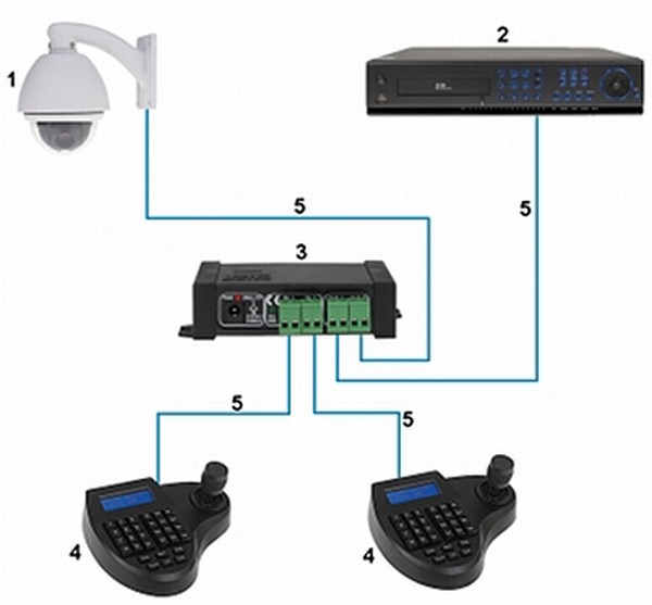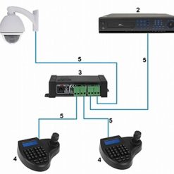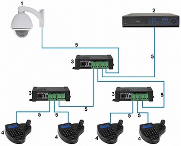 Il dispositivo consente inoltre di dividere un unico bus RS-485 in 2 canali e quindi permette l’utilizzo di una topologia a stella. Di conseguenza, ogni telecamera può essere collegata da un cavo separato RS-485 avente una lunghezza di fino a 1200m, facilitando così l’organizzazione del cablaggio nell’impianto CCTV e aumentando le distanze massime di trasmissione del segnale RS-485.