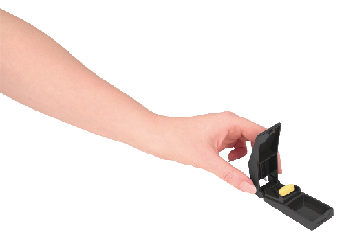 Lo spezza compresse consente di dividere agevolmente in due le compresse. La lametta nel supporto spezza in due la compressa, e nel comparto anteriore si possono conservare le compresse.