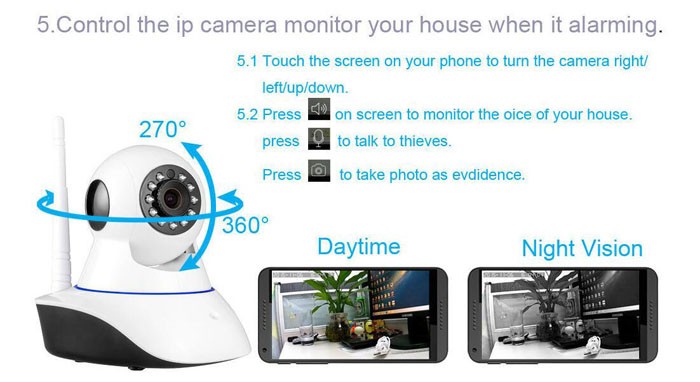 Telecamera IP HD 720p wireless Wi-Fi motorizzata con rilevazione del movimento (motion detection), invio e-mail con fotogrammi. Registrazione video su TF CARD.Inoltre la videocamera ha un Intercomunicante bidirezionale. E’ possibile quindi ascoltare e parlare.Visione notturna con led infrarosso e sensore di rilevamento luminosità.