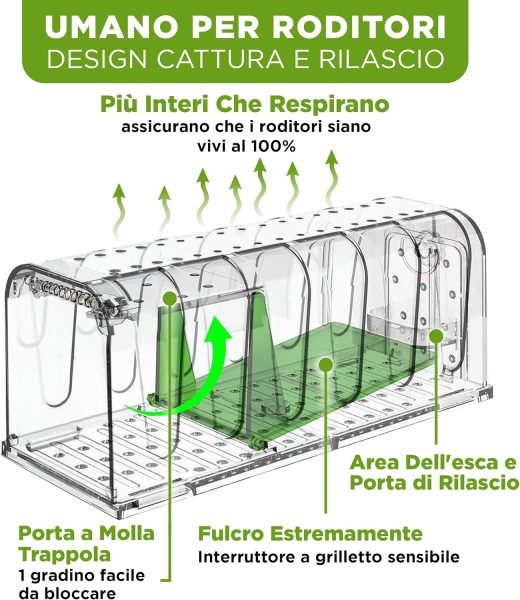 - CATTURA E RILASCIO SENZA IMPEGNO – Le nostre trappole per topi sono progettate per catturare i topi senza stress e in modo non crudele. Grazie ai fori di aerazione supplementari e all’ampio spazio a disposizione, queste trappole vivono in un ambiente confortevole per i topi.